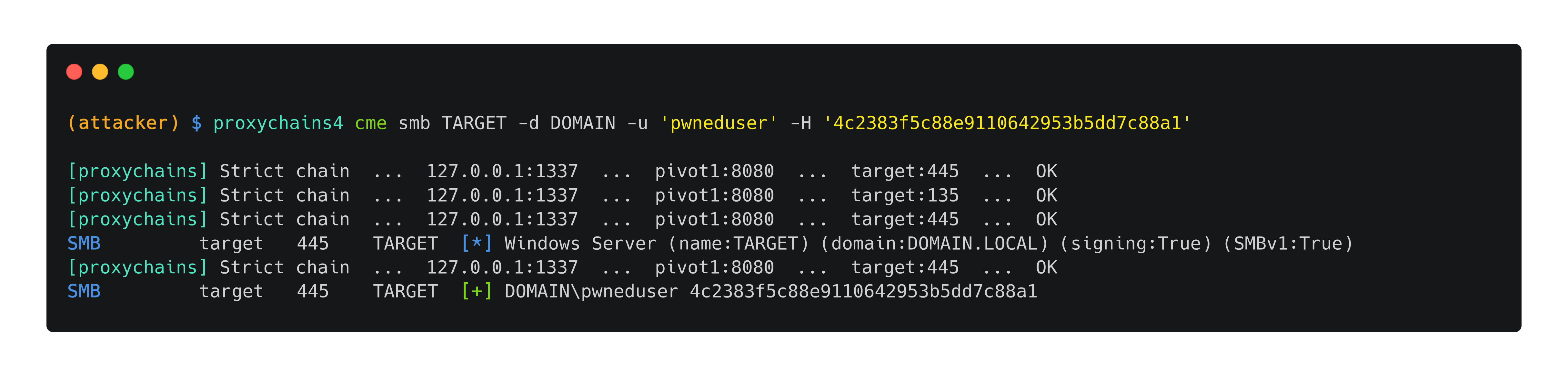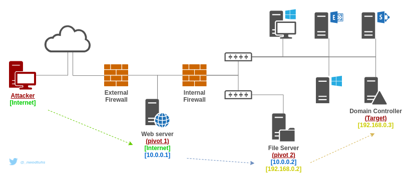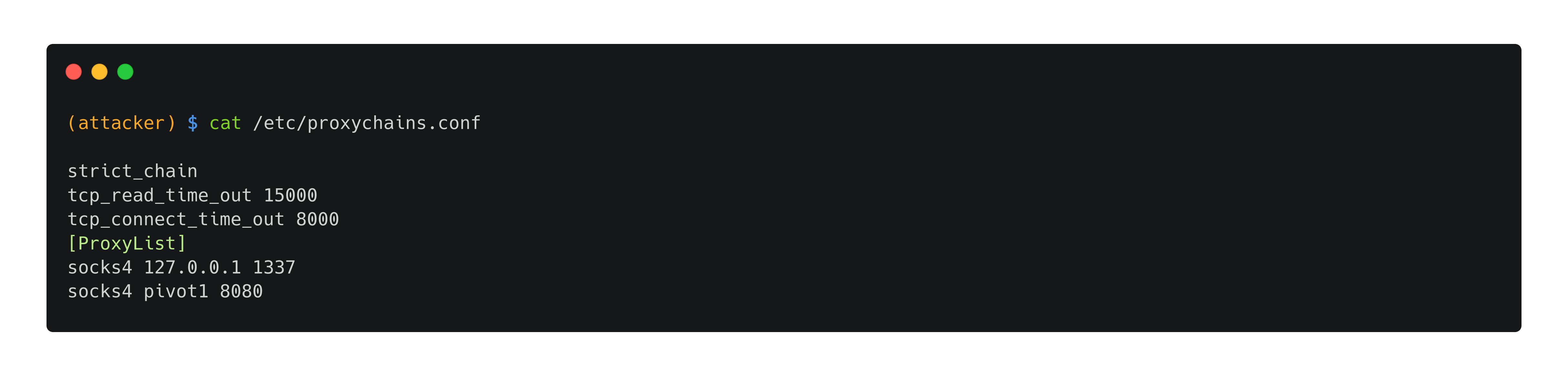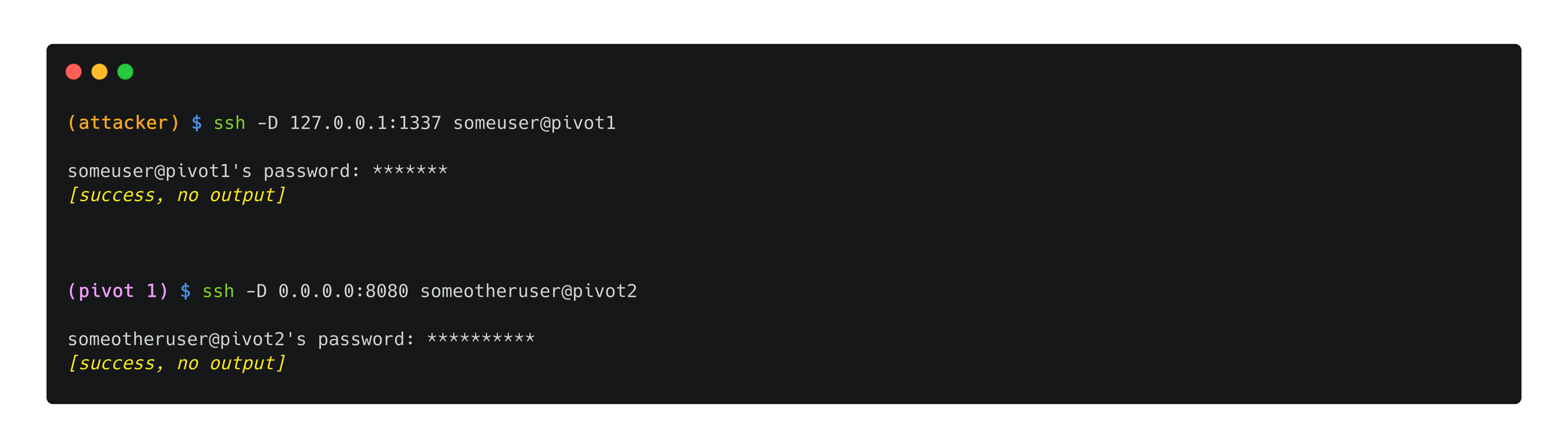 In certain scenarios, SOCKS proxies can be chained. This can easily be used with proxychains. In the following example, SSH is used to turn compromised machines into SOCKS proxy servers.